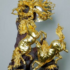 Hình ảnh song mã gợi cho người ta nghĩ đến sự hòa hợp, thành công và may mắn. Chính vì thế, Uniking xin giới thiệu với quý khách hàng bức tượng song mã gỗ trắc được bọc vàng 9999 vô cùng trang trọng.