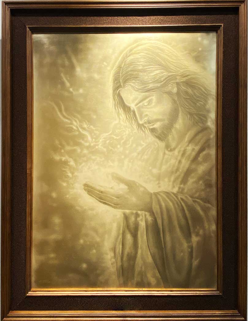 Nơi lòng nhân từ và niềm hy vọng được kết tinh trên nền vàng 9999 đầy tôn quý. Trong khoảng không gian mờ ảo, chân dung Chúa hiện ra với ánh mắt hiền từ và đôi tay nâng niu luồng sáng rực rỡ, tựa như nguồn năng lượng ấm áp đang lan tỏa để sưởi ấm những tâm hồn đơn côi và dẫn lối cho những bước chân lầm lạc. Tác phẩm là lời nhắc nhở thiêng liêng về tình yêu thương vô bờ bến, mang đến cảm giác được che chở, an ủi và thắp sáng niềm tin vào những điều thiện lành, vĩnh cửu.