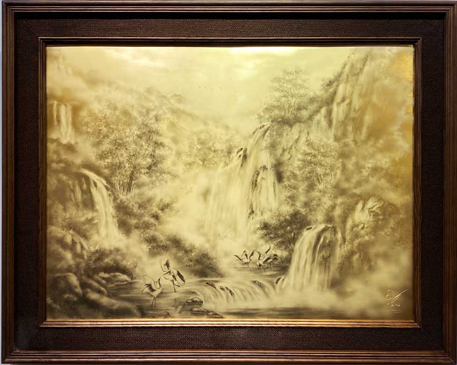 Hình ảnh đàn hạc tiên thong dong quần tụ nơi dòng nước giao thoa không chỉ gợi lên sự an lành mà còn là biểu tượng của sức mạnh đoàn kết, nơi mọi nguồn lực đều quy tụ để tạo nên một nền tảng vững chắc. Giữa màn sương khói mờ ảo và những tán cây xanh mướt được họa vàng tỉ mỉ, “Bách Lưu Quy Tụ” mang đến một thông điệp mạnh mẽ về sự thuận hòa: khi trăm dòng cùng hướng về một đích đến, vượng khí sẽ tràn trề và gia đạo sẽ mãi hưng thịnh, vinh hiển.
