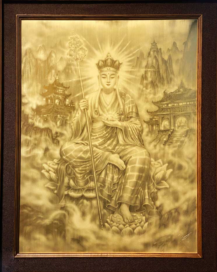“Trên nền tranh họa vàng lung linh, hình tượng Địa Tạng Vương Bồ Tát hiện ra đầy uy nghiêm mà gần gũi giữa chốn mây ngàn đỉnh Cửu Hoa. Những đường nét bằng vàng ròng thanh mảnh không chỉ tạo nên vẻ đẹp sang trọng, cốt cách thoát tục, mà còn tượng trưng cho đại nguyện kim cương – vĩnh cửu và bất biến trước dòng thời gian.