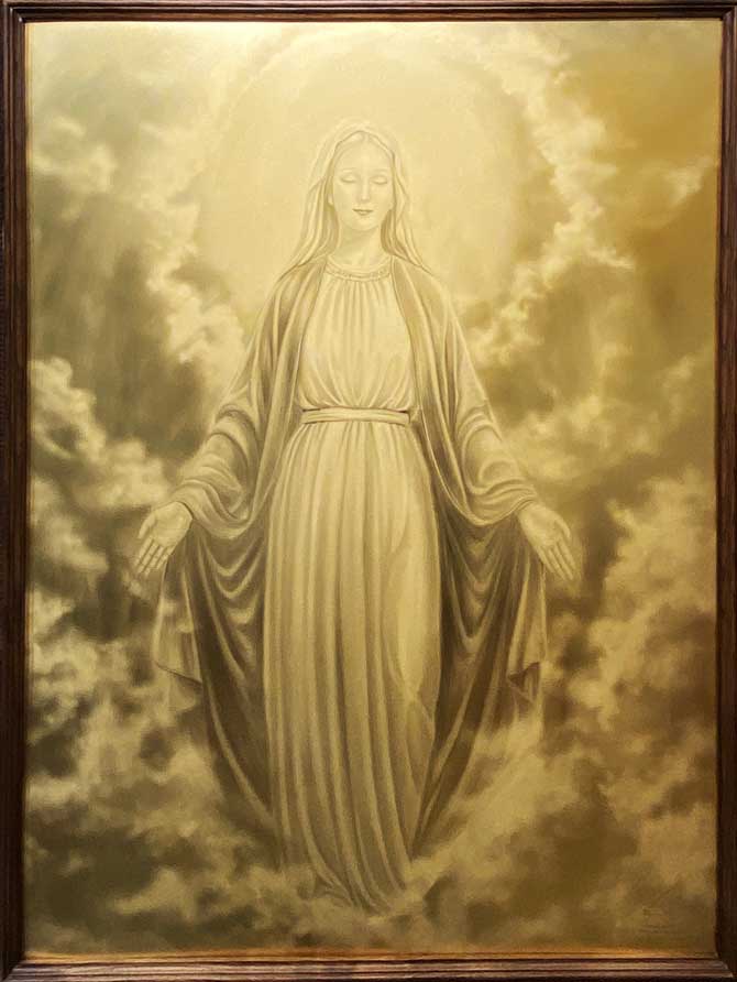 Chân dung Đức Mẹ hiện ra với gương mặt thanh tú, đôi mắt khép nhẹ đầy tĩnh tại và đôi tay dang rộng như đang ôm trọn cả nhân gian vào lòng để vỗ về, che chở. Những vầng mây sáng rực vây quanh tỏa ra luồng ánh sáng dịu nhẹ, không chỉ tôn vinh vẻ đẹp thánh thiện của Mẹ mà còn soi rọi vào những góc khuất tâm hồn, xua tan mọi lo âu và phiền muộn.