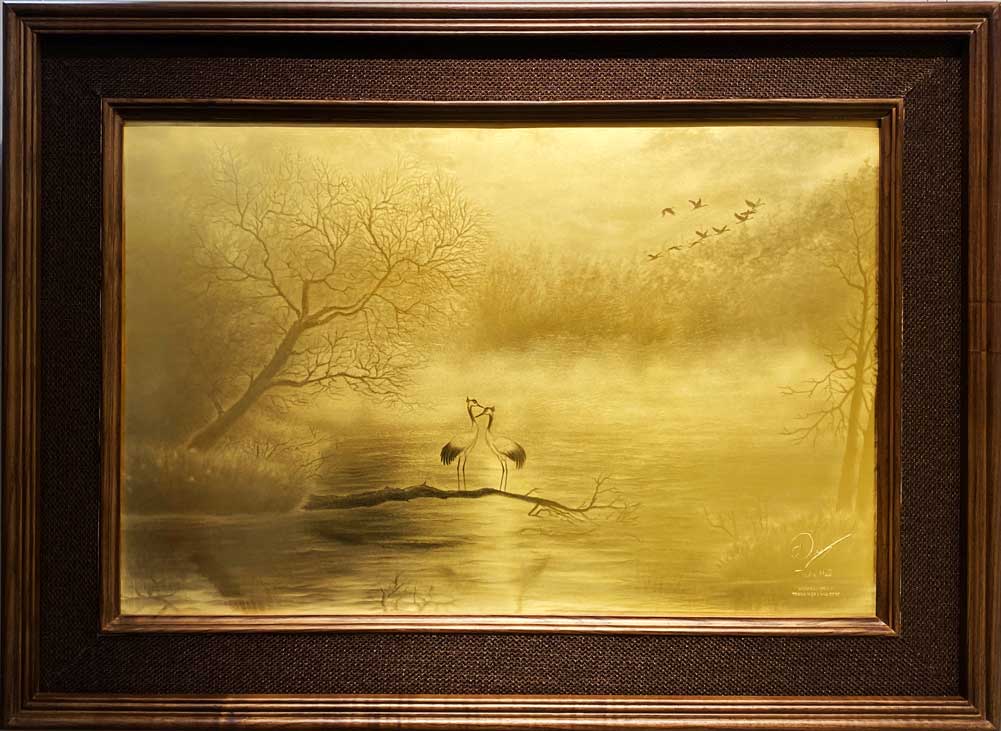 Khát vọng tự do và vươn xa: Hình ảnh đàn chim bay lượn phía xa trên bầu trời tạo nên sự đối lập thú vị với nét tĩnh tại của đôi hạc bên dưới. Điều này tượng trưng cho sự hài hòa giữa “tĩnh” và “động”: dù tâm ta có an nhiên, tĩnh tại thì ý chí và khát vọng vẫn luôn vươn xa, hướng tới những chân trời mới.