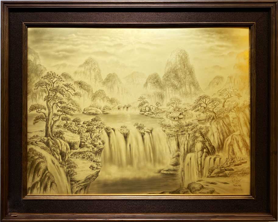 “Sơn Thủy Hữu Tình” – một khoảng lặng bình yên dệt nên từ những nét họa vàng 9999. Giữa màn sương bảng lảng, nếp nhà tranh nhỏ nép mình bên những tán tùng già và đàn hạc thanh cao, gợi nhắc về một bến đỗ an yên, nơi tâm hồn được gột rửa mọi muộn phiền. Đó là sự giao hòa tuyệt mỹ của đất trời, nơi dòng chảy tiền tài không bao giờ cạn và vượng khí luôn đong đầy trong từng nhịp sống, mang đến lời chúc về một cuộc đời viên mãn, hạnh phúc và thịnh vượng trường cửu.