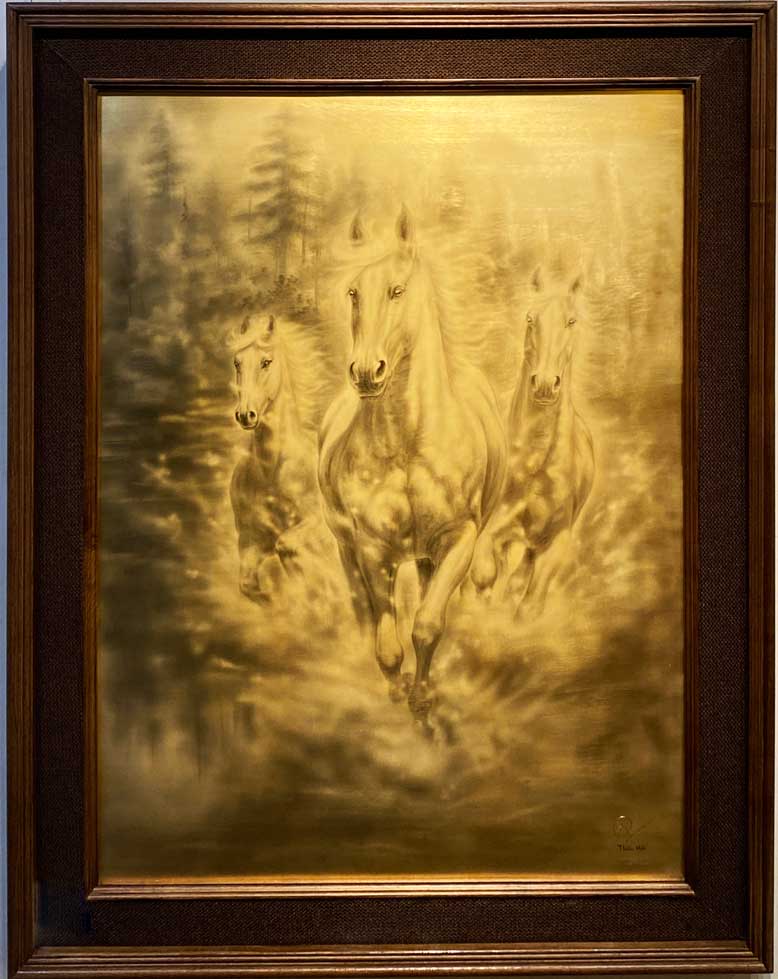 “Tam Mã Tiến Tài” – một lời chúc phúc êm đềm về sự sung túc và khởi đầu thuận lợi. Ba chú ngựa dũng mãnh cùng sải bước song hành giữa làn sương mờ của núi rừng, biểu trưng cho sự hòa hợp, kiên định và tương trợ lẫn nhau để dẫn lối tài lộc về nhà. Không quá ồn ào hay phô trương, nhịp bước của “Tam Mã” toát lên vẻ thong dong của những người đã làm chủ được vận mệnh, mang theo nguồn năng lượng bền bỉ để biến những dự định thành thành trái thơm, quả ngọt.