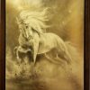 Vẻ đẹp của sự rạng rỡ: Hình ảnh chú ngựa hiện lên rõ nét giữa khung cảnh rừng cây và mây mù huyền ảo. Kỹ thuật họa vàng 9999 trên đồng giúp chú ngựa như phát sáng, tượng trưng cho một tâm hồn trong sáng, trí tuệ thông suốt và một tương lai rạng ngời phía trước.