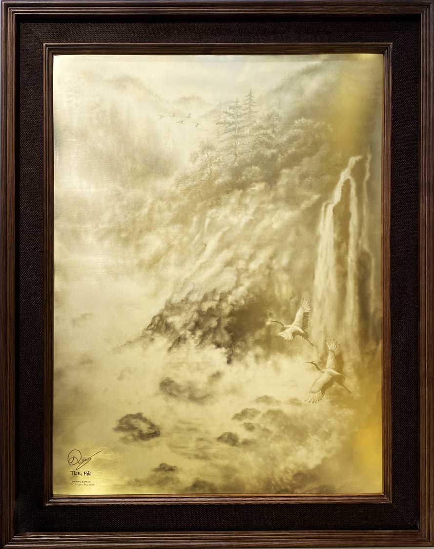 Sự giao thoa giữa hư và thực: Kỹ thuật họa vàng 9999 trên nền đồng làm cho những áng mây và dòng nước như đang chuyển động, lúc ẩn lúc hiện dưới ánh sáng. Nó gợi mở về một không gian tâm linh huyền bí, nơi con người có thể tìm thấy sự bình yên tuyệt đối khi hòa mình vào đại ngàn.