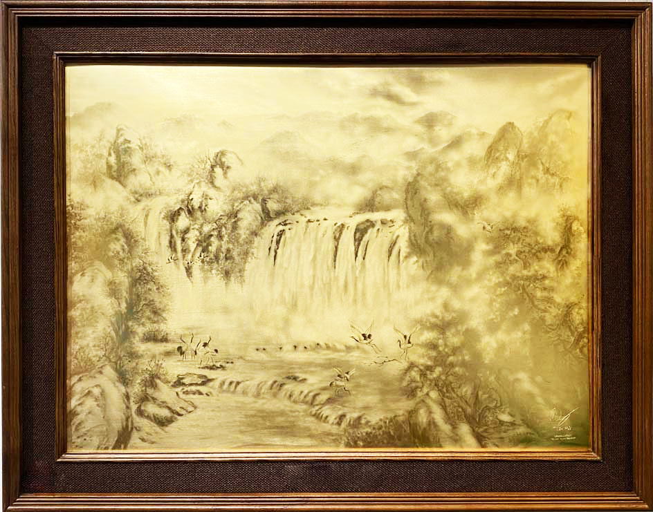 Bức tranh là một lời cầu chúc tốt đẹp về một cuộc sống ổn định, dài lâu và ngập tràn phúc lộc. Trên nền vàng 9999, hình ảnh đàn hạc tiên – biểu trưng của sự cao quý và trường cửu – đang thong dong quần tụ bên dòng thác đổ, gợi lên một viễn cảnh về sự an cư lạc nghiệp, nơi “đất lành chim đậu”. Sự kết hợp giữa dòng nước tuôn chảy mạnh mẽ và những gốc tùng vững chãi không chỉ tạo nên vẻ đẹp hùng vĩ của thiên nhiên mà còn là biểu tượng cho sức khỏe dẻo dai và sự thịnh vượng bền gốc. Tác phẩm của họa sĩ Vũ Thiên Hải mang lại cho không gian một luồng sinh khí ấm áp, giúp tâm hồn người thưởng lãm luôn tìm thấy sự bình yên và tự tại mỗi khi ngắm nhìn.