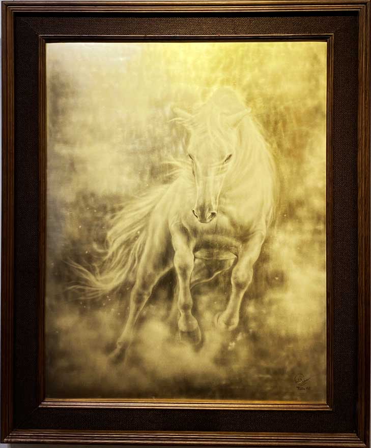 “Vạn Lý Truy Phong” – biểu tượng của sự bứt phá độc bản và khí phách kiêu hùng của bậc dẫn đầu. Giữa không gian mờ ảo của bụi đường và gió lộng, chú ngựa hiện lên đơn độc nhưng tràn đầy sinh khí, tựa như một luồng sáng vàng rực rỡ xuyên thấu mọi giới hạn.